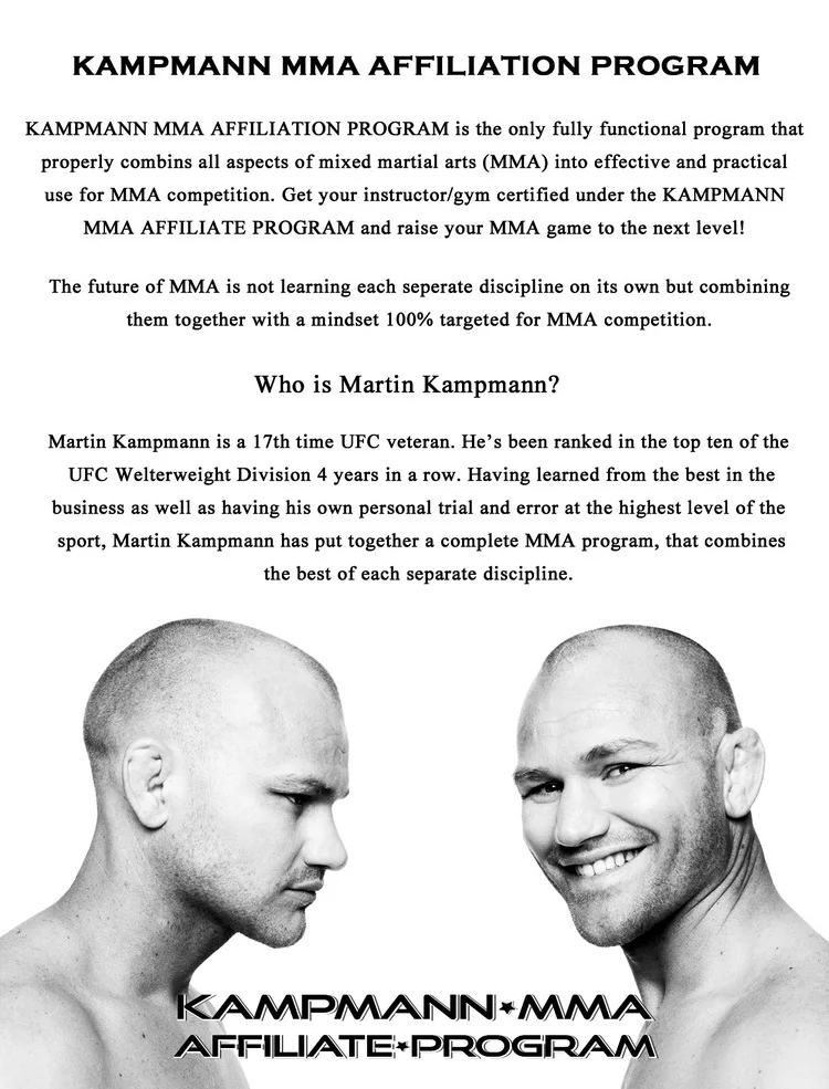 KAMPMANN MMA AFFILIATION PROGRAM is the only fully functional program that properly combines all aspects of mixed martial arts (MMA) into effective and practical use for MMA competition. Get your instructor/gym certified under the KAMPMANN MMA AFFILIATE PROGRAM and raise your MMA game to the next level.